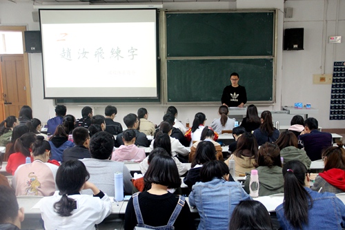 在本次讲座中,赵汝飞老师创新性地提出了书写四大定律,即字如一张网,网格均匀就漂亮;字如一杆秤,提起平稳就周正;字若太阳光,四射参差就飞扬;字像楼一栋,稍有侧度就灵动。并通过举例子等方式为同学们指正了书写过程中应注意的问题,同学们积极配合赵老师的讲解并认真记录要点。在之后的提问环节中,同学们针对自己想深入了解的问题向赵老师请教,赵老师一一做出解答,并提出自己的意见和建议。